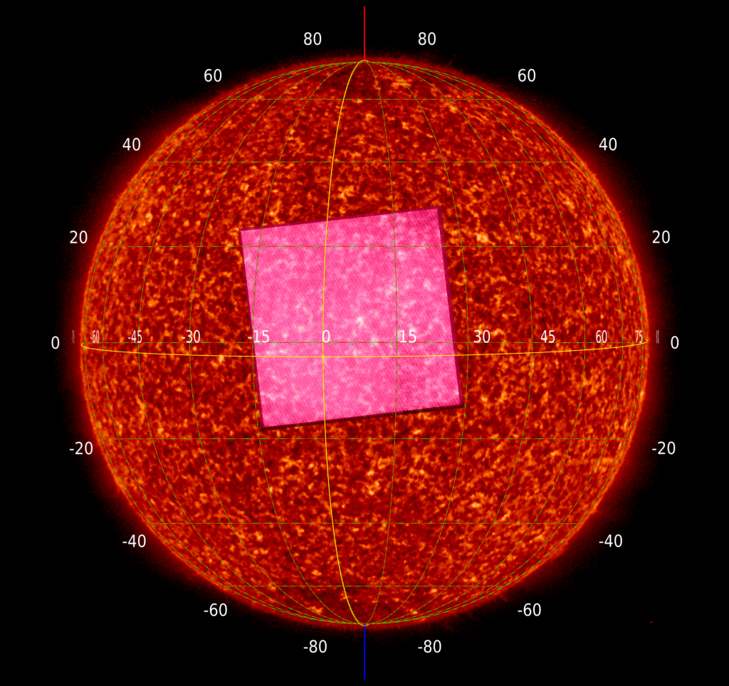 Les images du disque solaire complet à 17,4 nm (jaune) et 30,4 nm (rouge) ont été prises avec l’imageur Full Sun (FSI). L’encart gris a été pris avec l’imageur haute résolution dans l’EUV (HRIEUV). L’encart rose a été pris avec l’imageur haute résolution en Lyman alpha (HRILYA).